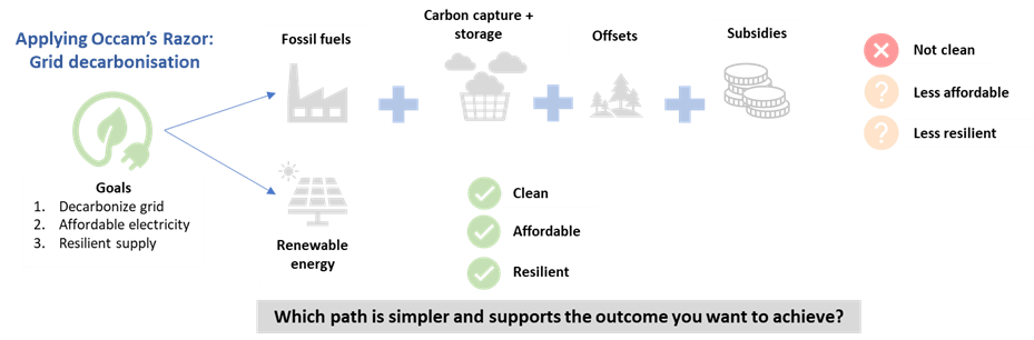 Occam’s razor states, simple solutions (not to be confused with simplistic thinking) are better than complex ones because they are easier to execute, are more comprehensible, and therefore adopted more swiftly. It is particularly helpful in making a preliminary conclusion in the absence of comprehensive data. I can think of two decent examples, decarbonization and company valuations. If we asked, how could we decarbonize an economy in the fastest, most just way? The answer surely would be to electrify everything that can be electrified – heating, transport, buildings, industry. Why? Because the technology is proven, the economics works (see diagram below), it improves energy security, and drastically improves accessibility. In short, it is the most simple and effective path forward.