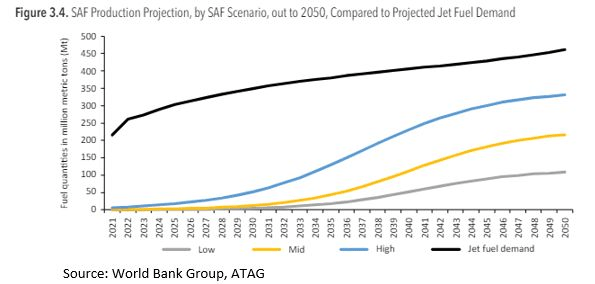 Future demand for sustainable aviation fuel is highly uncertain given its dependancy on (among other things) national emissions plans, supportive policy, and technological development. By 2050, IRENA estimates demand of >100 billion litres each year to achieve a 50% emissions reduction, 200 billion litres for an accelerated, 1.5 degree scenario. IATA estimates ~450 billion litres in the same period. There are a dozen other models all with varying figures. The figure though is irrelevant. What we need to observe is the rate of scale, along with sufficient policy to ensure commercial viability.