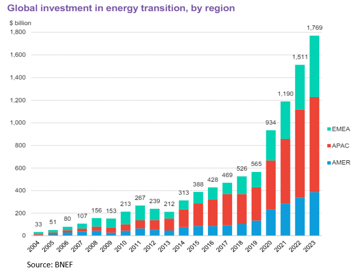 This encouraging chart from BNEF shows the exponential increase in energy transition investment, but it also highlights the most persistent challenge we face, regional capital concentration. EMEA includes Africa but European investment was 66% of regional flows, the USA accounted for 78% of flow in the Americas, and China accounted for 80% of APAC flows.