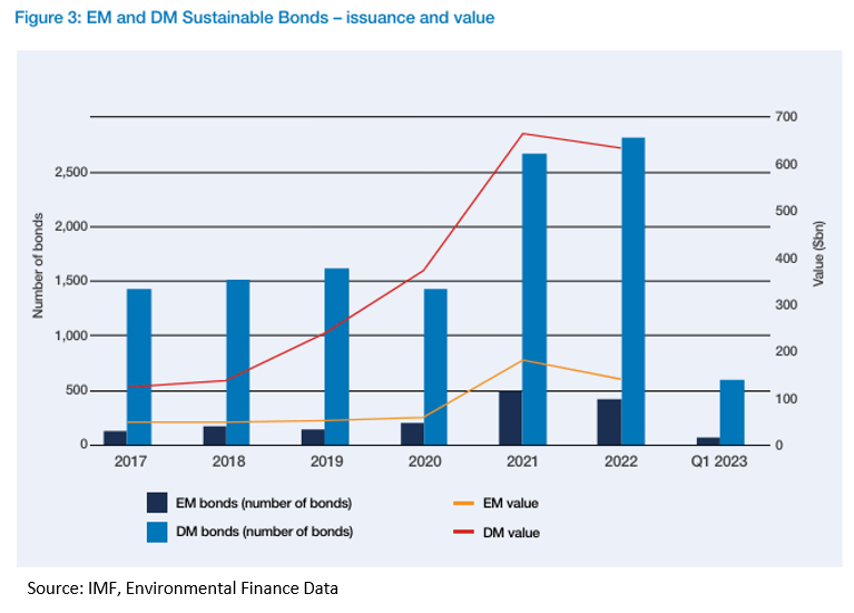 There are however bright spots. Improvements in regulatory frameworks, data availability, and supportive policy, are all contributing towards increased private investment. In Asia (ex-China), that is bringing liquidity into areas such as infrastructure, energy, and transportation. The EM sustainable bond market has also seen a ~4-5x increase from 2017 in terms of volume and value. Innovative structures – including wildlife bonds, blue bonds, and debt-for-nature swaps – have also helped to deepen and diversify the investor base.