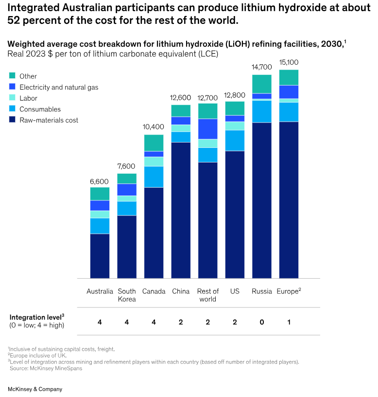 Mining is a clear example. For decades we have exported (primarily to China) various materials, iron ore, lithium, bauxite, etc, but have failed to establish a processing industry. Australia accounts for 43% of global lithium extraction but has only recently started to refine these materials domestically. The opportunity? Potentially US$10b when/if lithium prices return to a more historical average of ~US$24 per kg (internal rate of return, “IRR”, of upto 36%). Even in the current scenario where oversupply has dessimated production plans and pricing to ~US$15 per kg, IRRs may still reach 12 to 21% [7].